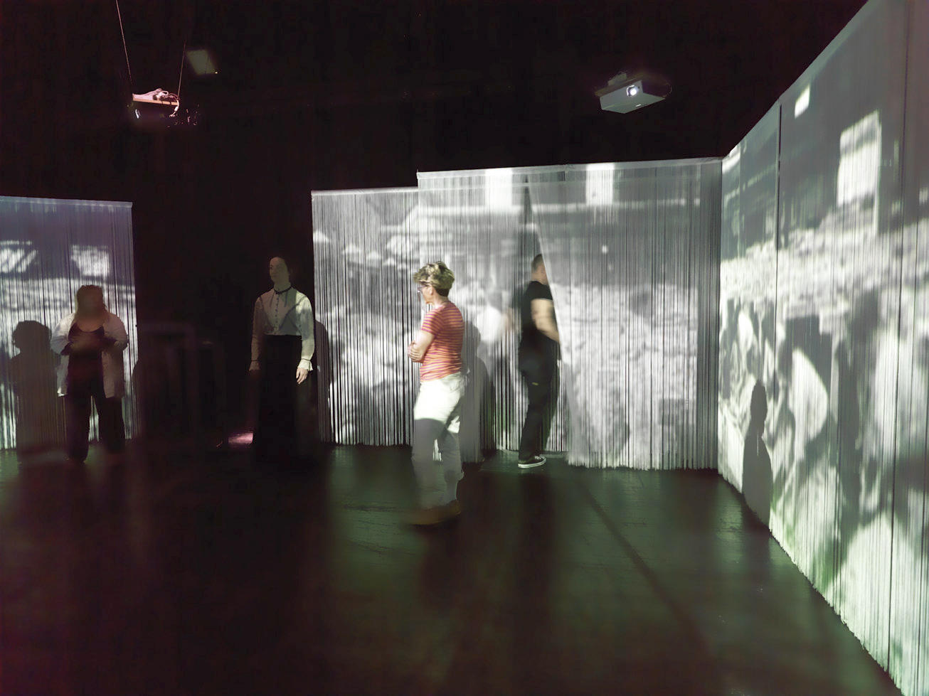 Vestibule and staircase: speakers; space 1: four projectors; rehearsal stage: five projectors, speakers, string curtain, lighting; two actors; publication A6 format