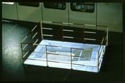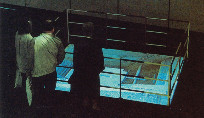 Video installation: video projector, video recorder, videotape, construction site safety fence. Interactive video installation: video projector, computer-controlled laser disc, computer, sensors, live camera